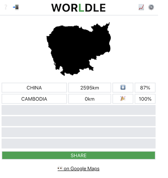 Worldle, a geography game somewhat inspired by Wordle. Here's the (spoiler!)
