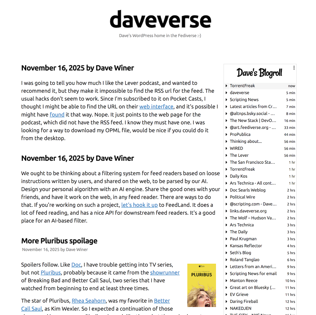 Here's a screen shot of what the Daveverse home page looks like. It's got all the stuff from scripting.com. It's not a perfect rendering of my Old School blog, I have more features, but it's pretty good. I'll be testing this out and thinking about it now, as we go forward. But here's the milestone: I have a WordPress place to hook into now that has pretty much everything I write outside the tiny little text boxes. What I write in WordLand or Drummer, the two places I write for real. The rest of it is throw away nonsense, a waste of time. No one reads anything, everyone fighting for attention. #