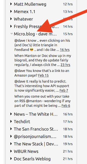 I post a lot of stuff to micro.blog via my linkblog RSS feed. Every one of those items can be commented on. But unless I visit micro.blog regularly, I don't see the comments. I guess people have mostly figured out that I'm an absent poster, and don't say anything. Even so, there are some replies. Wouldn't it be great if the responses could show up in my blogroll. And of course if there was an RSS feed of the replies, I would see them when I was looking for something possibly interesting, one of the main reasons I have a blogroll, and keep finding new uses for it. #