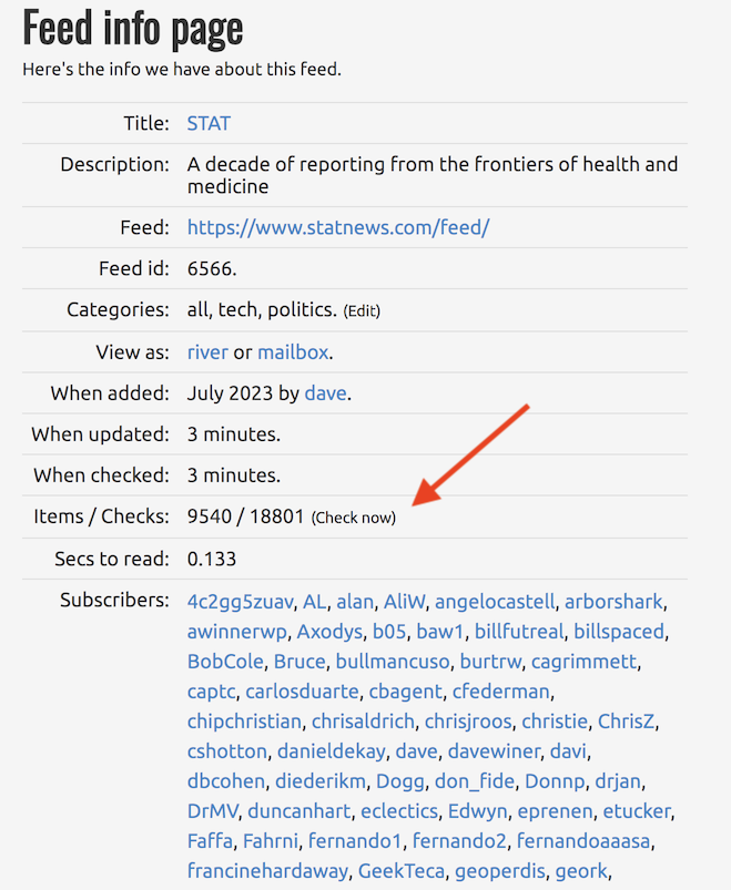 Suggestion for feed reader devs. Put a Check Now button on the page for a single feed. It shouldn't overburden your system because it's just doing an HTTP read and a little parsing. Not much more work than reloading a page in the browser. The benefit is you can see a current view of the news according to a specific feed without waiting. Makes the web roughly instantaneous for every feed, even ones that don't support rssCloud. FeedLand has such a button. #