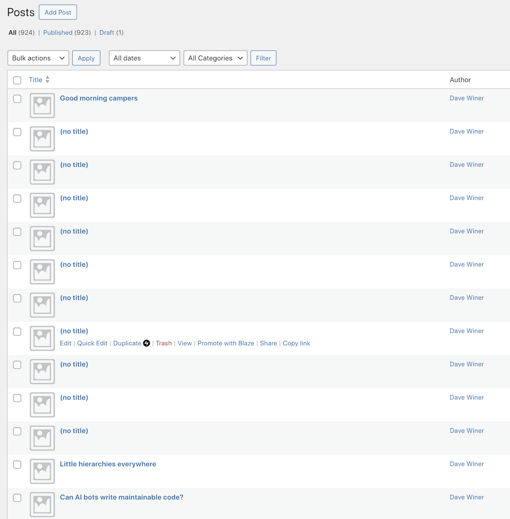 Feature request for WordPress. If an item doesn't have a title, you can do better than (no title) in the Posts list. Grab the first N chars of the body, or add a tool tip with the same text. I write a lot of "singular" posts, ie posts without titles. This is what I see on the Posts page. #