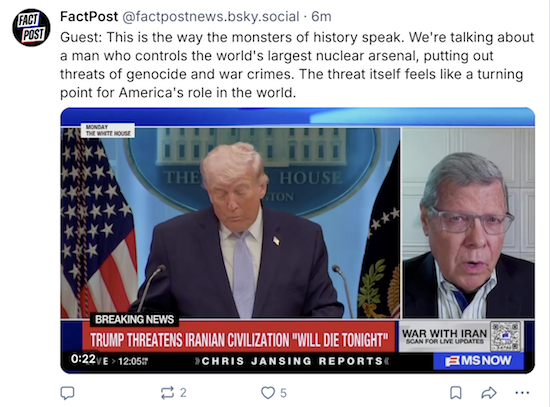 • The president of the United States is spinning around acting like a NYC real estate jumbo who accidentally was elected president and after only five years in office has realized a whole new level of trolling. It started with cable news, then went to Twitter, then masked American gestapo killing protestors on TV for everyone to see, and then starting a war with Iran of all countries. #