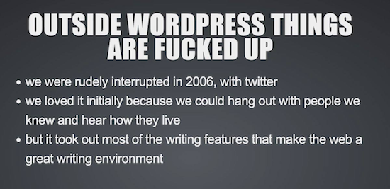 piece I wrote in August about thinking differently about WordPress. That's what I am the evangelist for, thinking about WordPress in a different, wider role, bringing the web to the people in a very usable way.