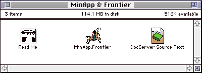 MinApp.Frontier is a Frontier install file. It contains an embedded script that teaches Frontier how to talk to MinApp.