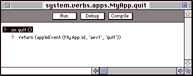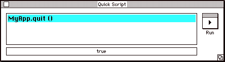Then click on the Run button. Frontier runs the MyApp.quit script; in turn, it sends an Apple Event to your application telling it to quit. If youÕve correctly implemented the required event suite (fingers crossed!) your application should no longer be running.
