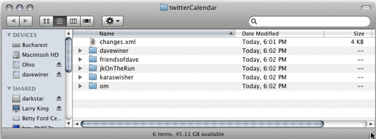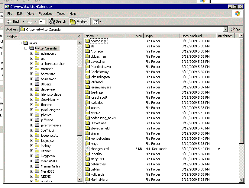At the top level is a calendar structure for 2009, there will be one for 2010 if we make it that far. calendar.opml is a structure that points to all the OPML files in the directory, so you can browse it in an outliner, such as the OPML Editor. today.opml has the most recent day's tweets. So if you want to see what Bijan's been doing today (or the last time he tweeted) you can look in this file.
