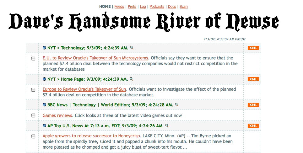 Until June 2009, that was the aggregator that shipped for the OPML Editor, a tool named newsRiver.root. In June I started work on a fresh new aggregator called River2. The goal was to incorporate all that we had learned about RSS aggregation in the last ten years, and combine it with several technologies that had gotten established since we began.