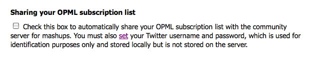 There's a new checkbox on the Prefs page that allows you to share your OPML subscription list.