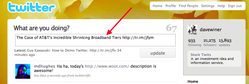 2. Your Twitter home page opens with the title of the page followed by the shortened URL in the edit box.